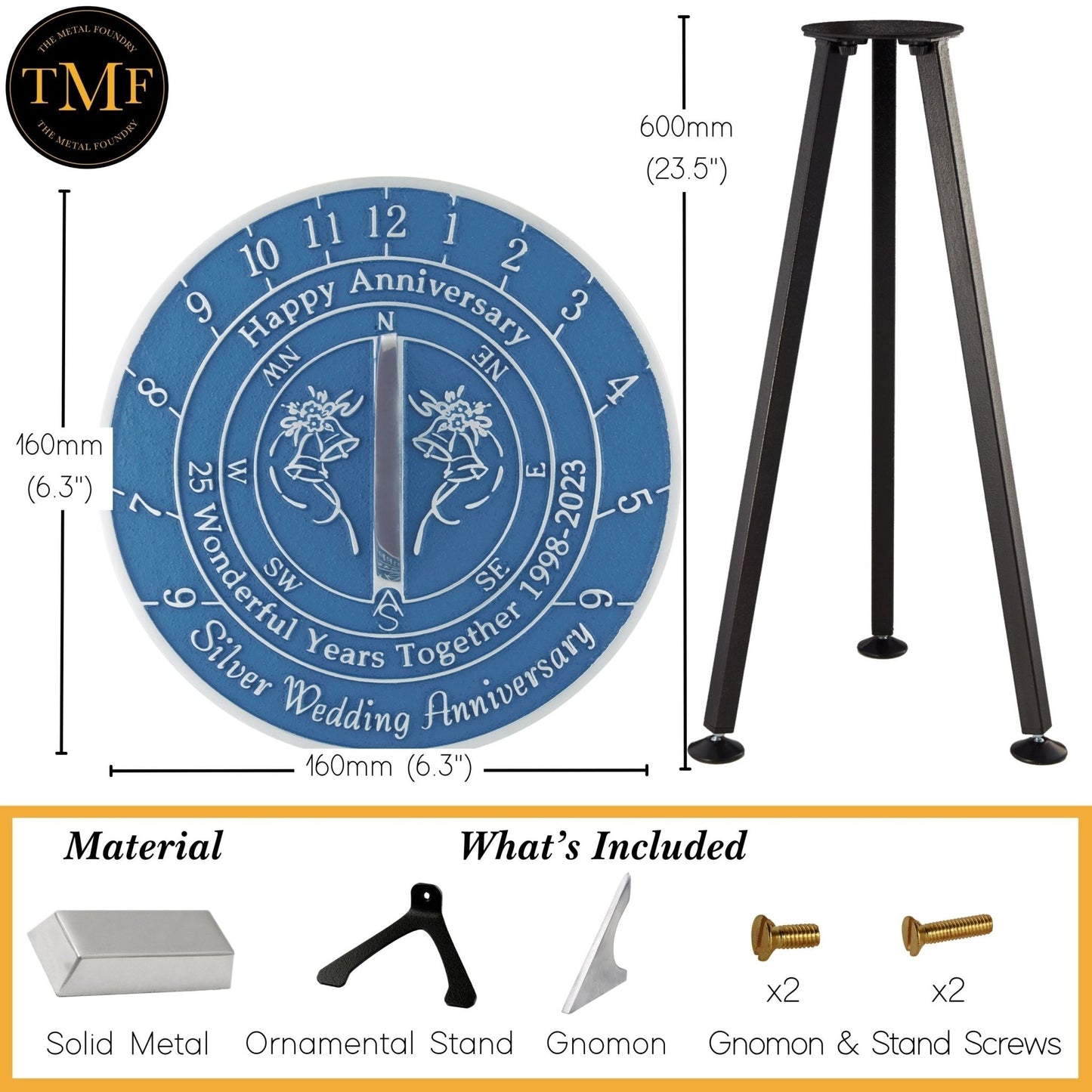Traditionally associated with silver, which symbolises radiance, harmony, and strength, the Silver 25th Anniversary Sundial is a meaningful tribute to this incredible milestone. Crafted from solid recycled aluminium and finished with a polished hand-painted design, this sundial reflects the elegance and significance of a lasting union.
